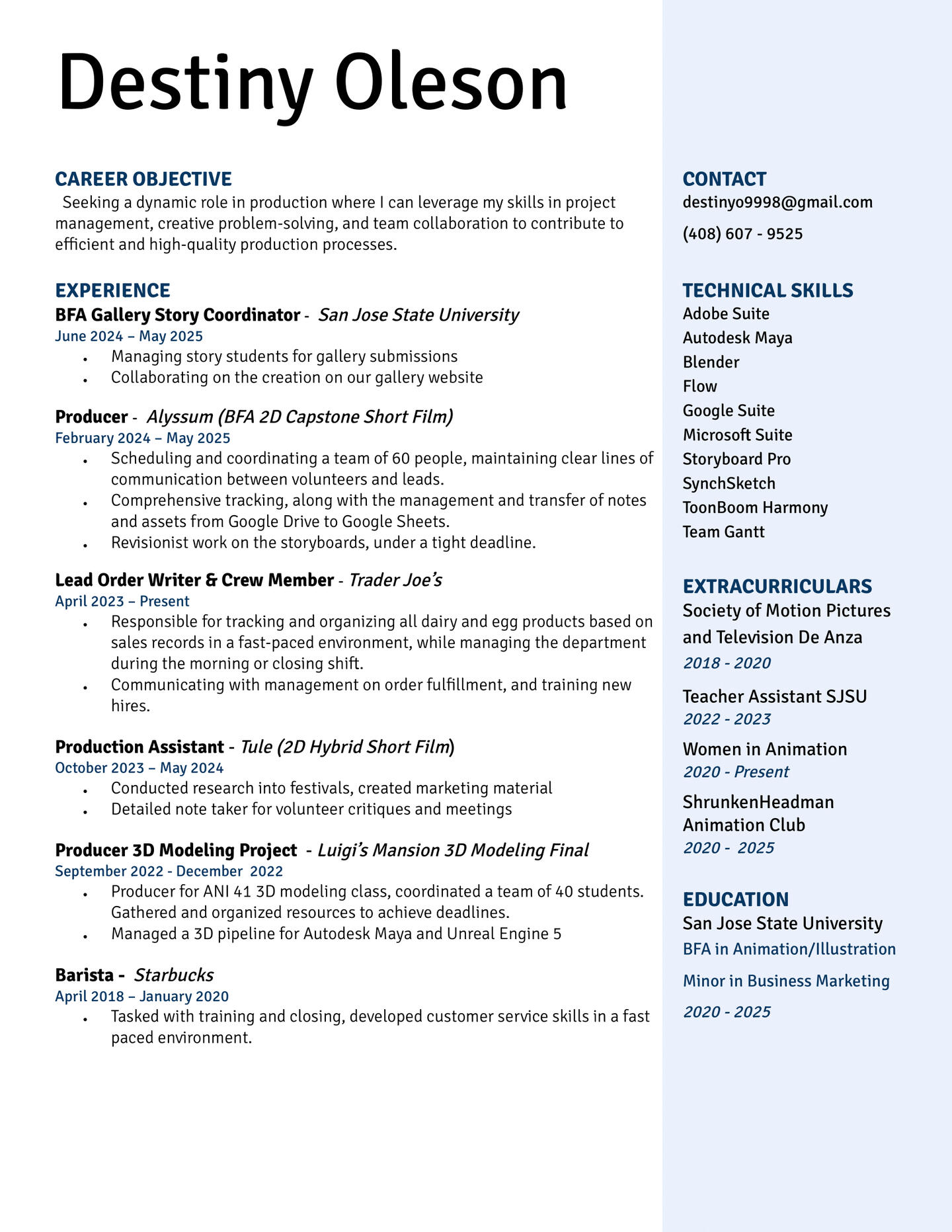 Destiny Oleson is passionate about production and story development.She has a BFA in Animation with a minor in marketing. She is seeking a dynamic role in production where I can leverage my skills in project management, creative problem-solving, and team collaboration to contribute to efficient and high-quality production processes.Contact: